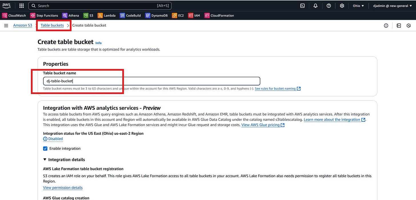 Want to get started? You can use AWS CLI. For example, Create a table bucket: